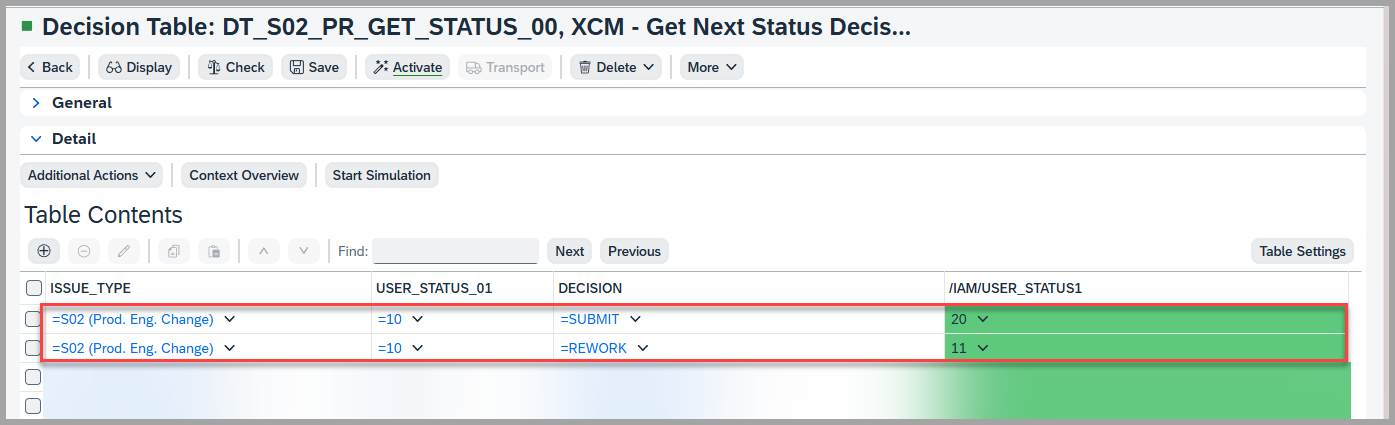 - You can also add any of the change record header fields as conditional columns to define the target status considering various conditions in BRF+