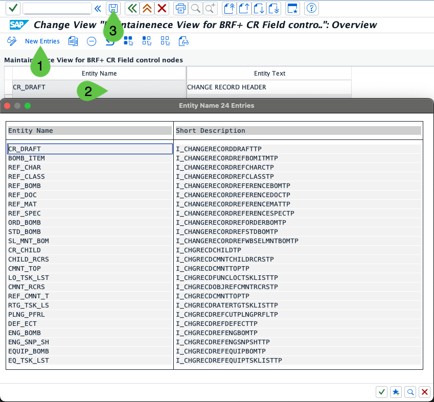 - Ensure the appropriate nodes are maintained in the configuration, such as CR_DRAFT for the Change Record header, BOM_ITEM for BOM items, and REF_DOC for Documents and so on. Only these entity names will appear in the F4 help when configuring BRF+.