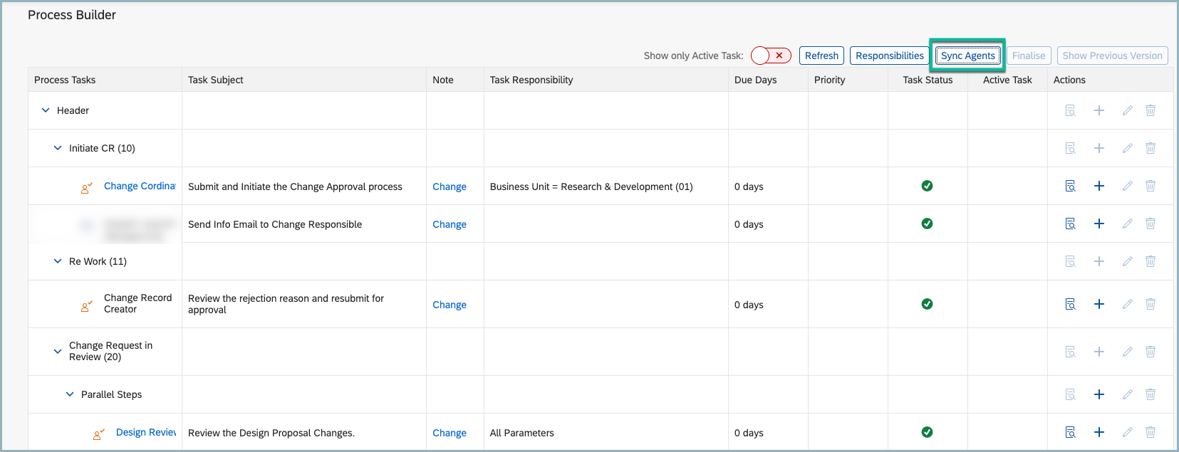 6. The “Sync Agent” button updates agent assignments across all statuses tasks defined at the Process Builder level. If any changes are made to agents or functions within the Teams and Responsibilities setup—and those functions are used in multiple statuses—clicking “Sync Agent” will apply the updates to all relevant statuses wherever they are used. In such cases, there is no need to regenerate the Process Builder.