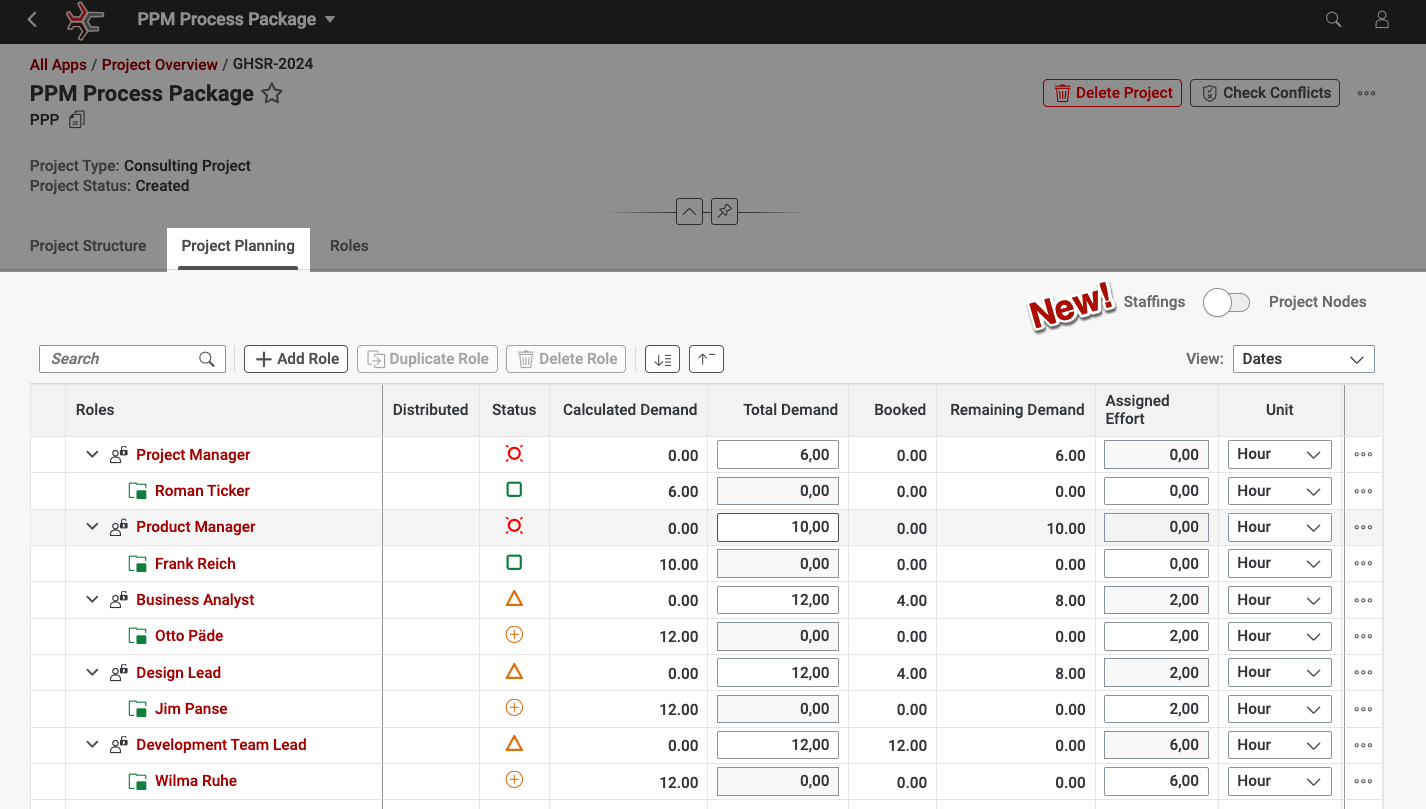 - Dual View Planning: Toggle between planning project nodes and staffing within the project, similar to the classic PPM UI’s “Staffing Overview.”