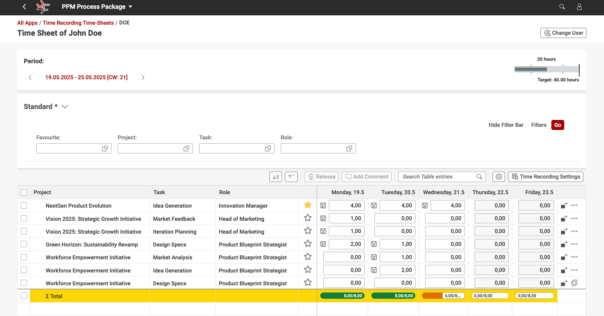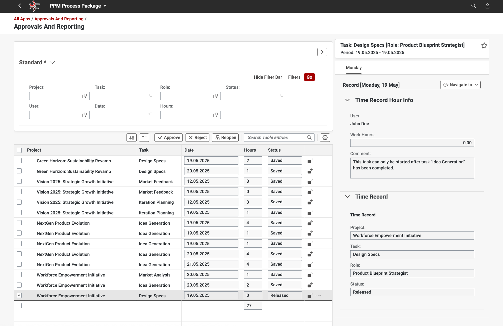 With version 2025.5, PPM Process Package introduces a completely reimagined time recording experience — built from the ground up to be faster, more intuitive, and more powerful. Whether you’re tracking hours, managing approvals, or analyzing time allocation across projects, this release brings a suite of modern tools to make your workflow smarter and more efficient.
