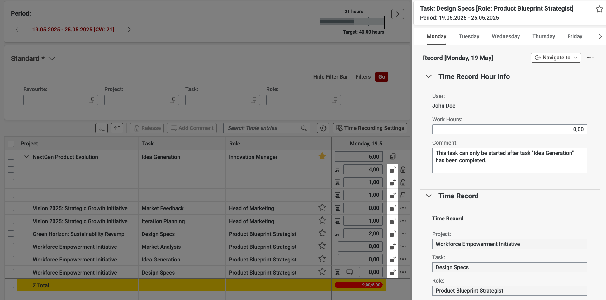 - Contextual Navigation & Editing: Easily edit work hours, add or review comments, and view contextual task/project information—all without leaving the time recording screen.