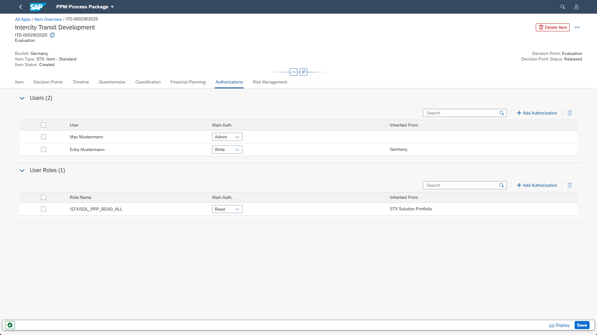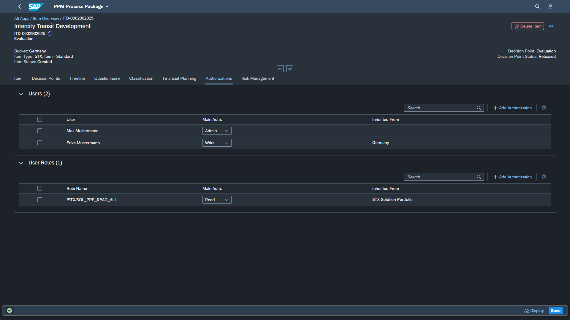 Following the SAP Portfolio Management standard, you can now create, edit, and delete user and role authorizations across portfolios, buckets, items, initiatives, reviews, and classifications.