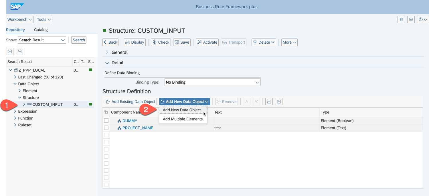 To include new custom input columns dependent on Z-Fields, enhance the CUSTOM_INPUT Structure directly within your BRF+. For this, navigate to the CUSTOM_INPUT structure inside your BRF+ Application and click on Add New Data Object: