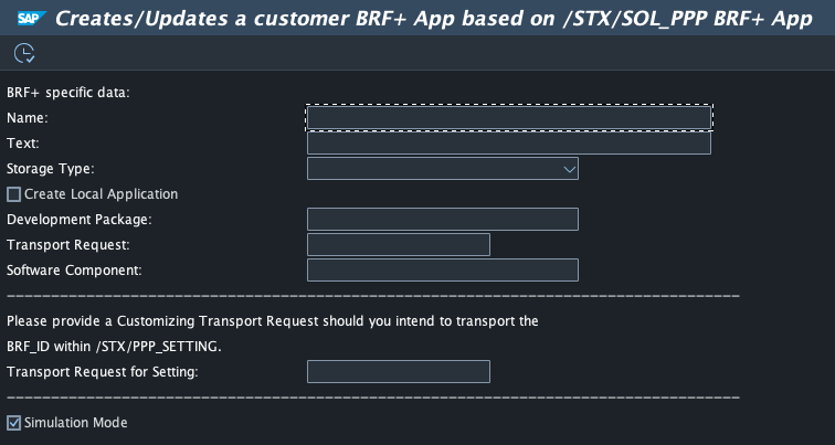 To proceed, access Transaction /STX/SOL_PPP_BRF+ (or employ Transaction SE38 and select Report /STX/SOL_PPP_CUSTOMER_BRF_APP) within your backend system. Upon access, you’ll encounter the following interfac