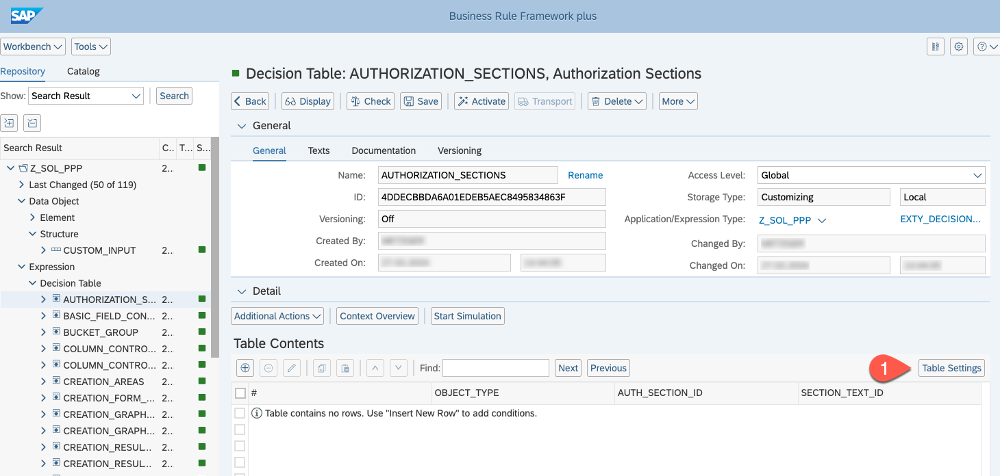 - Storage Type: You can choose between System (Client independent - transportable), Customizing (Client dependent - transportable) and Master Data (Client depending - not transportable). ❗This setting cannot be altered post-creation❗ For more info, please take a look at SAP BRF+ Storage Types.