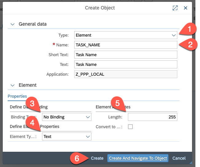 When choosing Binding to DDIC Element (Data Dictionary), you will be prompted with a value help for all existing DDIC Elements on your system. Simply choose the correct one and your Creation Popup will look like this:
