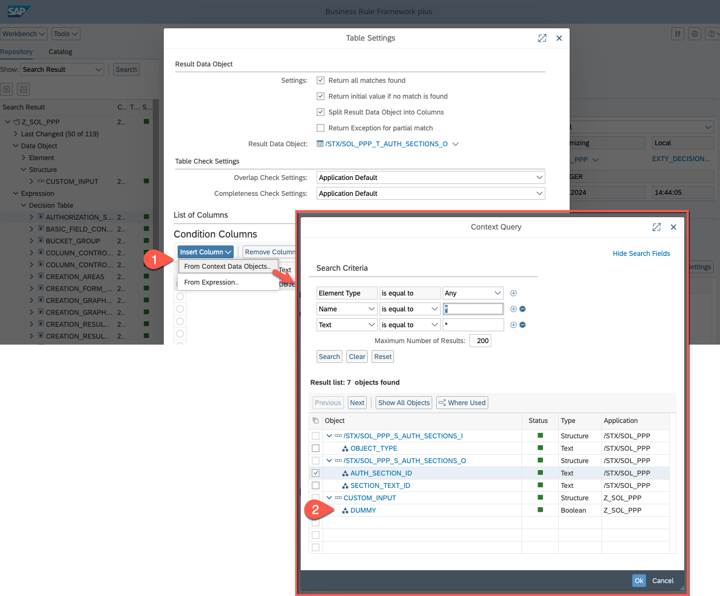 The report automatically replicates all Rulesets, Functions, and Expression Tables of the /STX/SOL_PPP_STANDARD BRF+ application into the newly created BRF+ application. Dependencies are automatically established, and a CUSTOM_INPUT Structure is created and set for all Functions to allow custom fields. Additionally, all Expression Tables are cleared.
