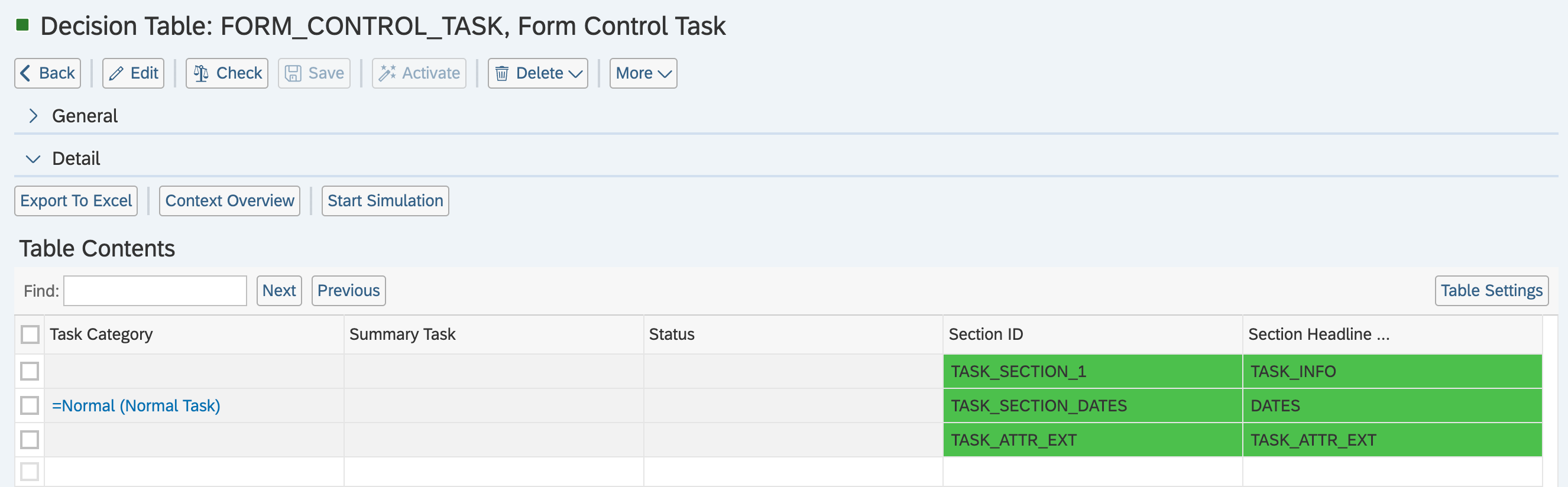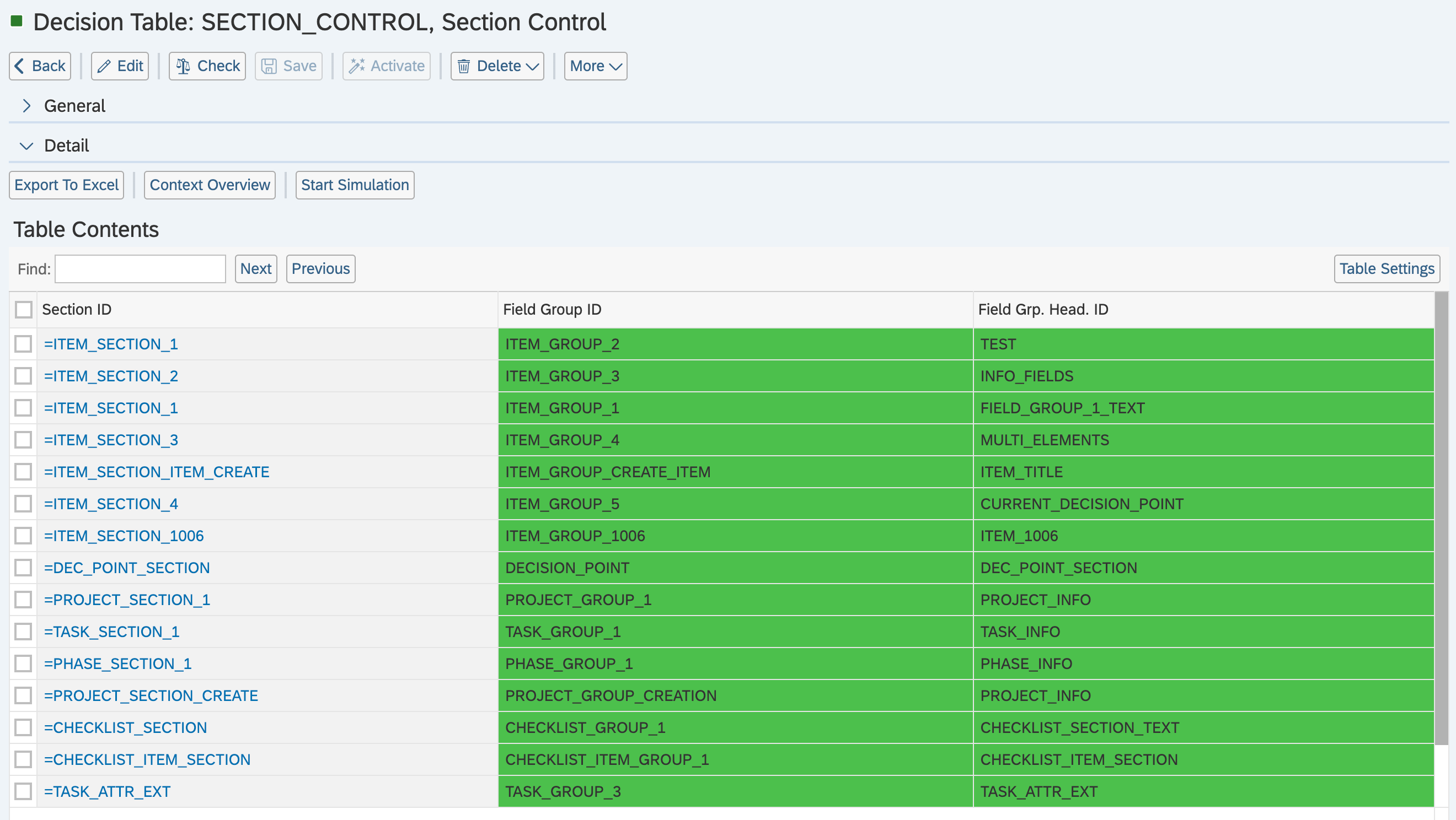 Open your BRF+ Application and navigate to the expression table “Section Control” (Technical Name: SECTION_CONTROL).