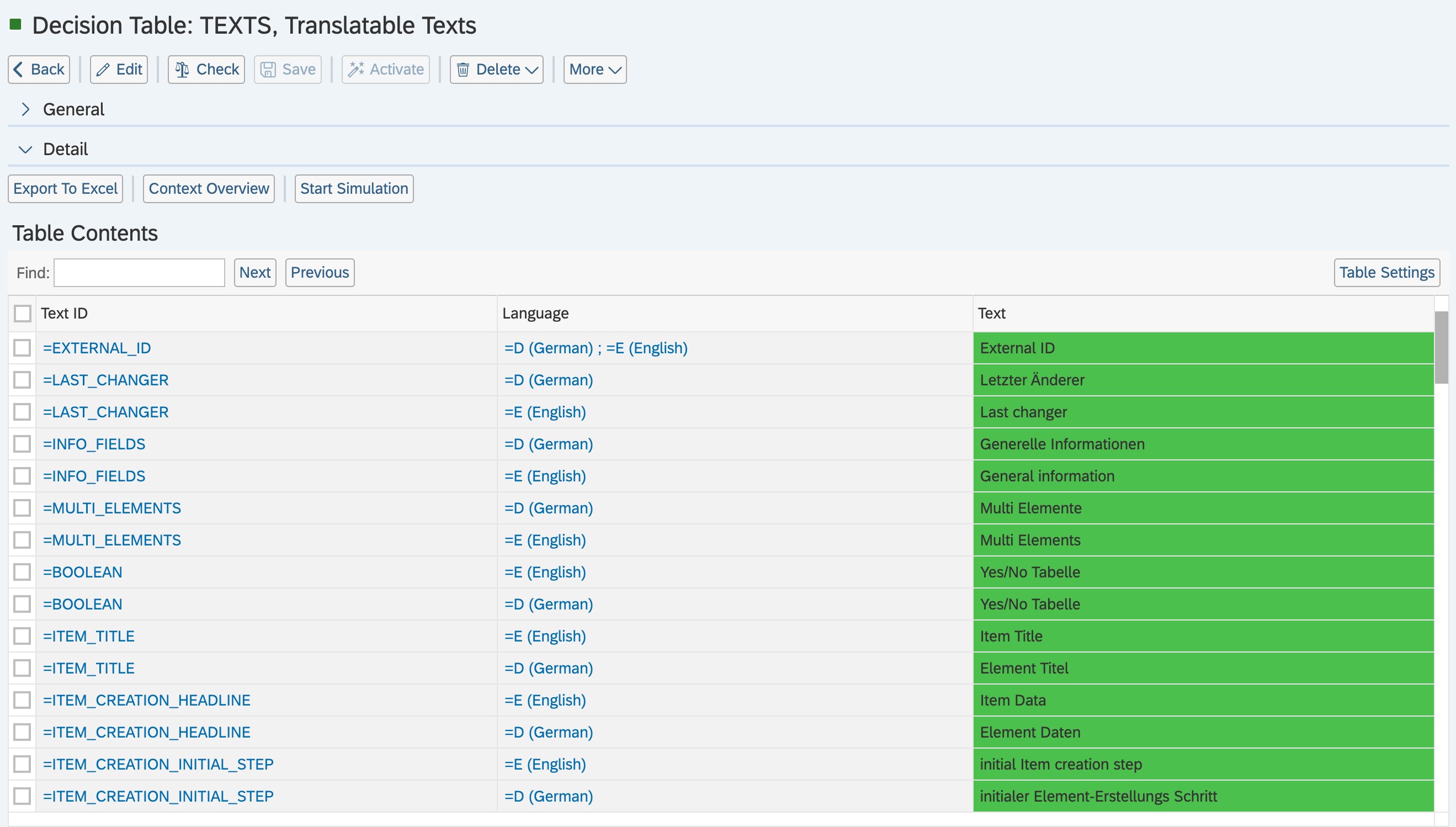 Open your BRF+ Application and navigate to the expression table “Translatable Texts” (Technical Name: TEXTS).