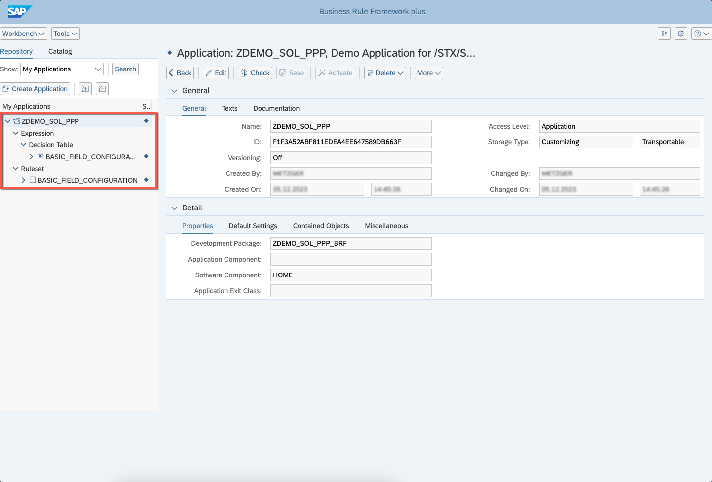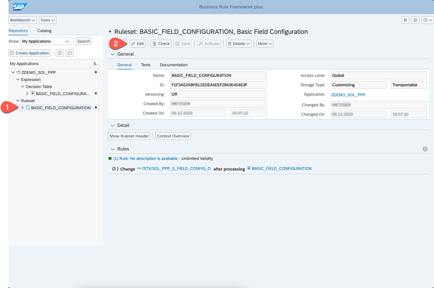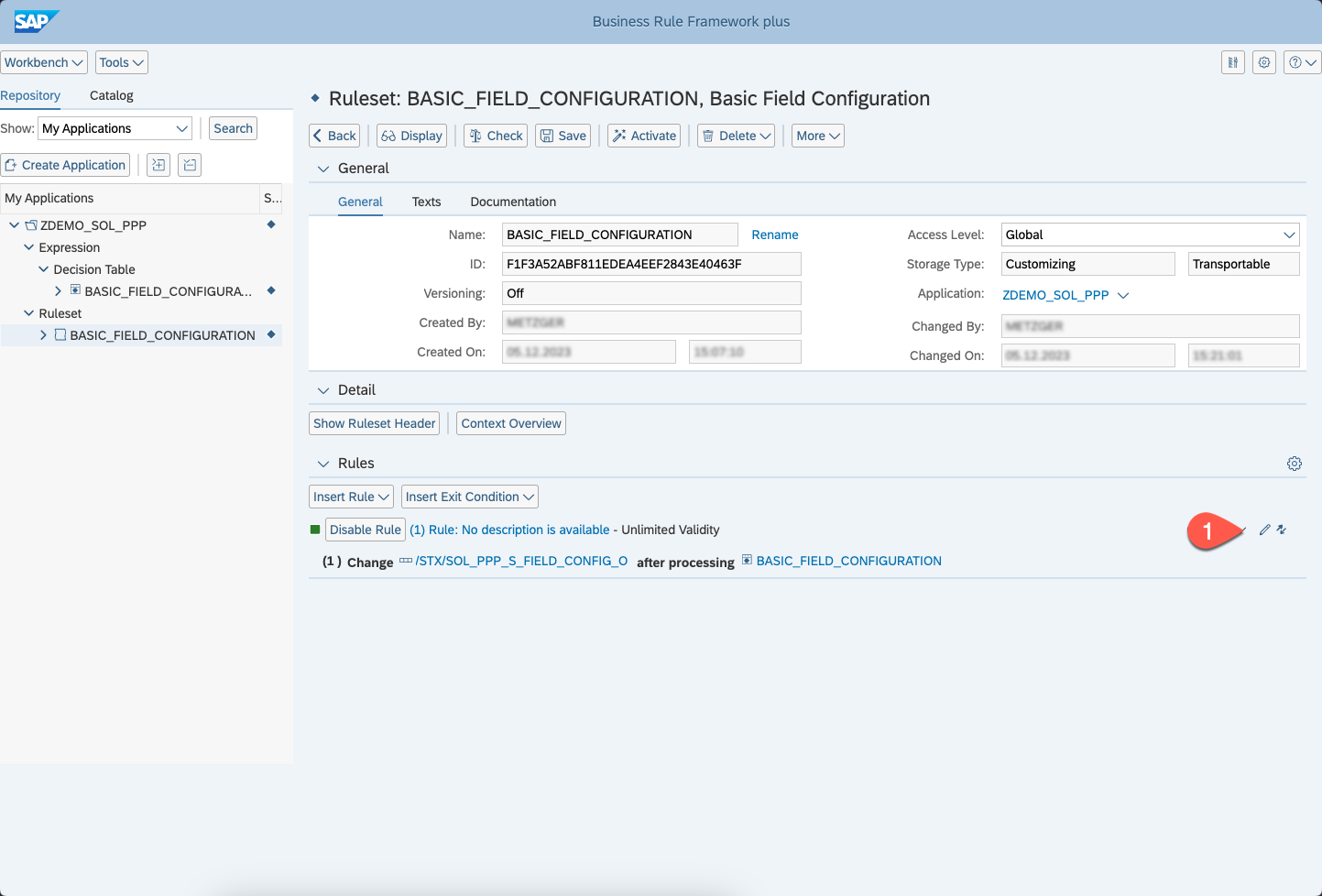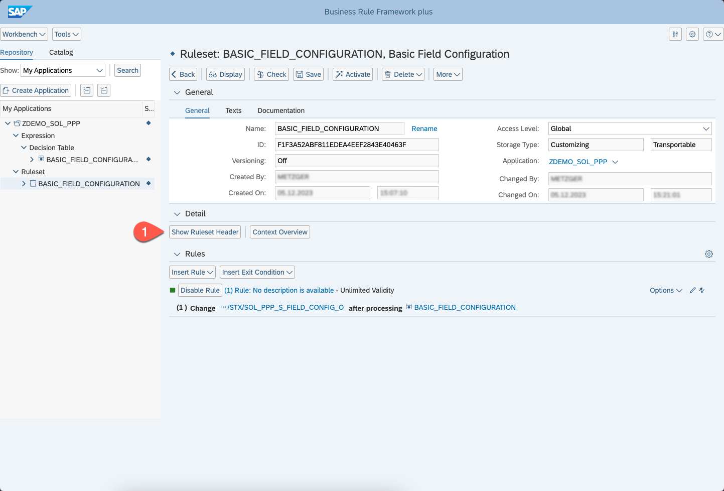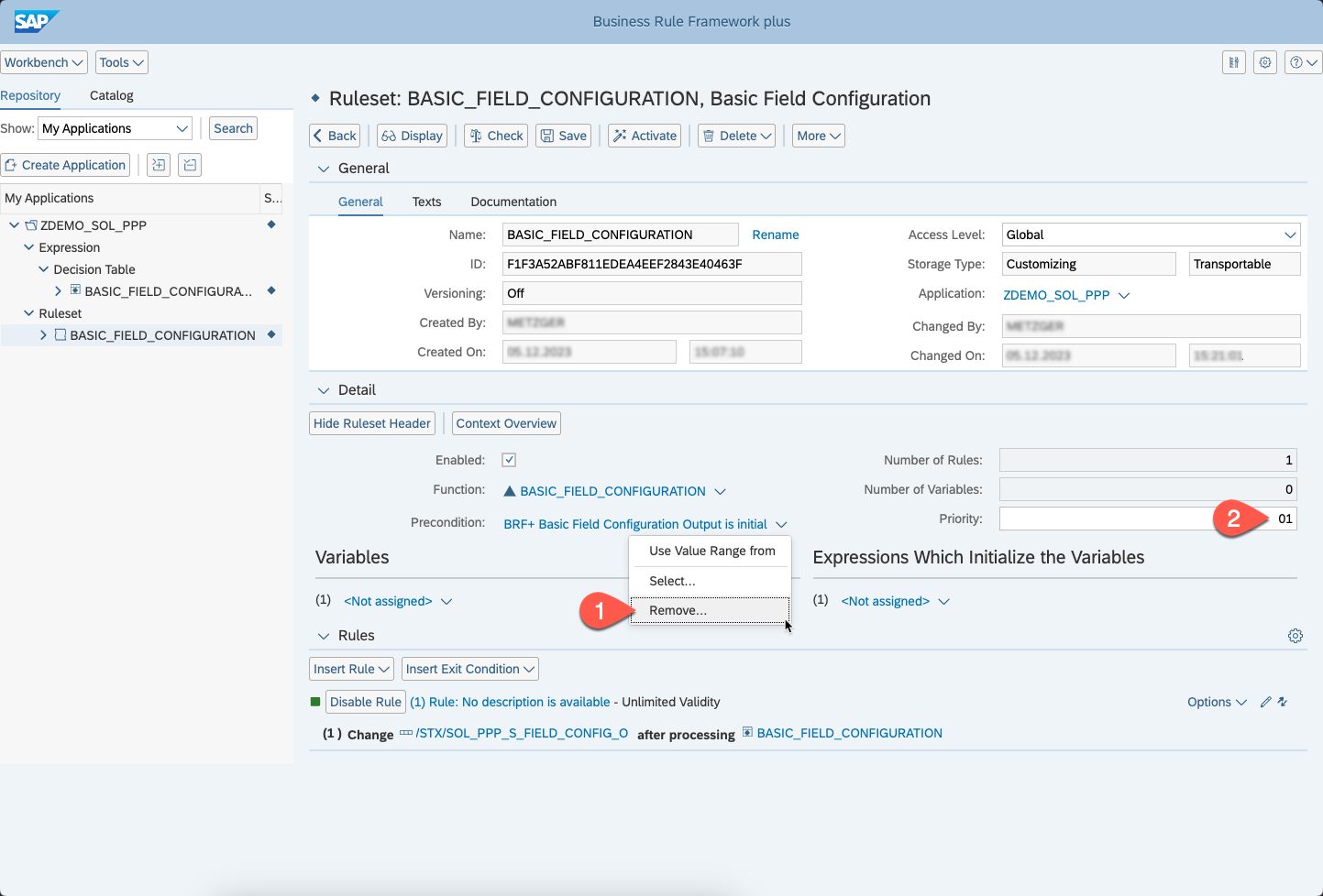 A detail page opens. In there, remove the precondition (only if the Ruleset is the first one on your Priority chain) and change the Priority. This priority later determines, which of your multiple BRF+ applications will be called first (STX Standard Customizing will always be called last and can even be turned off entirely. For further information see Section 2. Disable STX PPP Standard Customizing as Backup in Creation of Customer BRF+ Application).