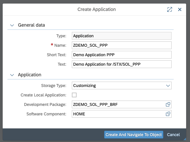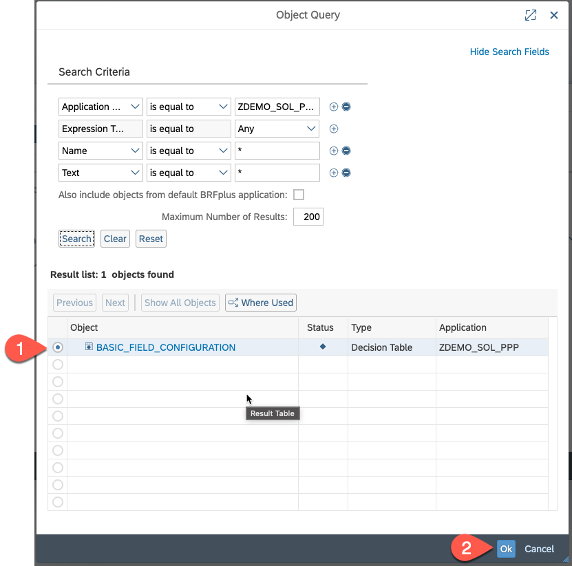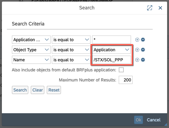 Search for your own BRF+ Application, which has been created during Creation of Customer BRF+ Application, via the search button. In the Popup, change the OBJECT_TYPE to Application and, the NAME to the name of your own Main BRF+ Application. (For this demonstartion, we created a BRF+ application via Creation of Customer BRF+ Application with the name /STX/SOL_PPP)