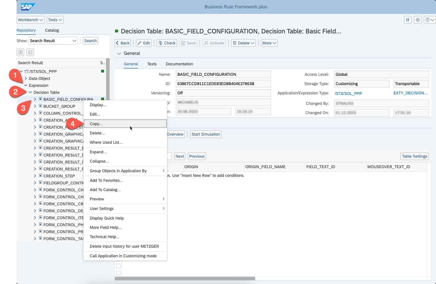 Now select an Expression Table, which you want to include in your second BRF+ application and right click it. Choose Copy.