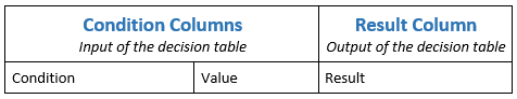 Result Columns specify the outcome or action to take when conditions are met. They represent the output of the decision table. These columns have a green background once a row is added.