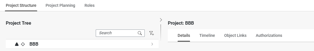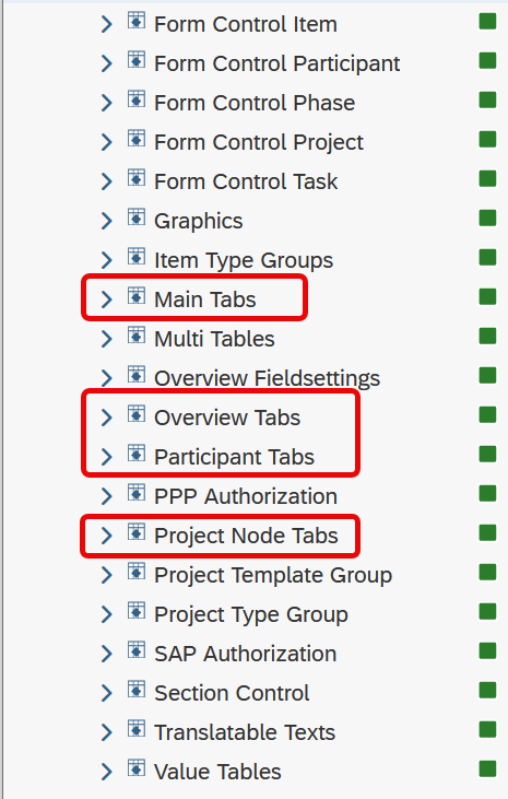 In PPP customizing Project Node Tabs effects the Tabs available in the Main Tab “Project Structure”. A “Project Node” has be selected in the List to access Project Node Tabs.