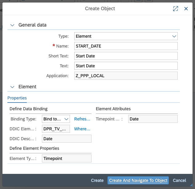 * When choosing Binding to DDIC Element (_Data Dictionary_), you will be prompted with a value help for all existing DDIC Elements on your system. Simply choose the correct one and your Creation Popup will look like this: