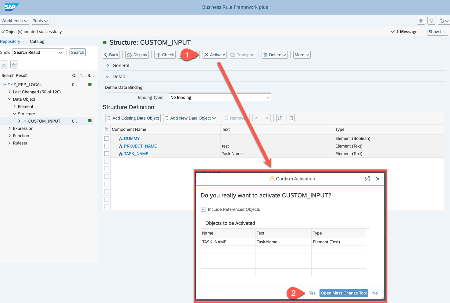 - In both cases, click Create and afterwards activate your CUSTOM_INPUT structure. Ensure the “Include Referenced Objects” checkbox is marked and press Yes.