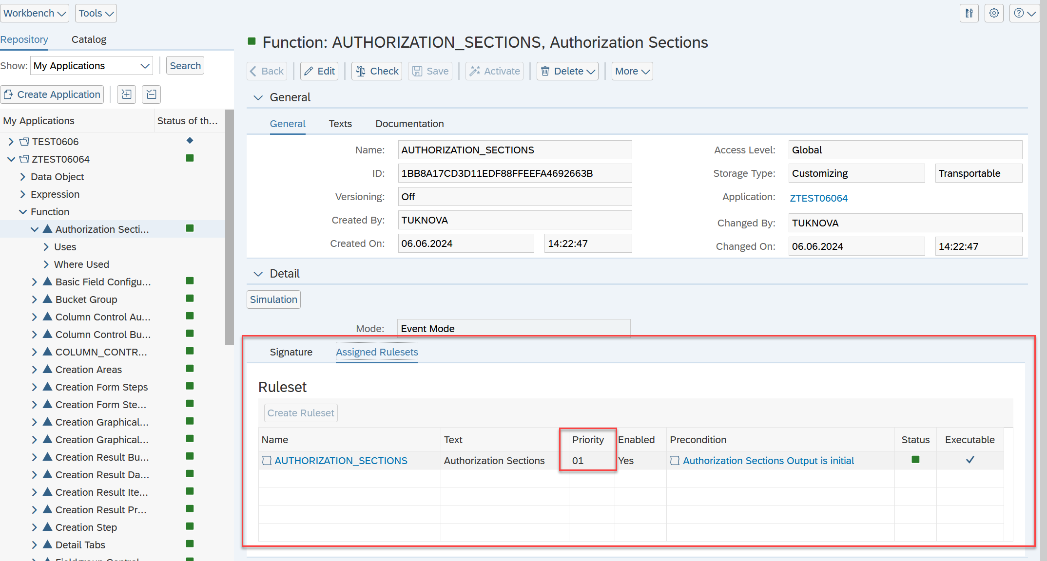 Here, you can see all the rulesets of a function ordered by their priority. The “top” ruleset is the one that gets evaluated first. You can also directly see if a ruleset is active, has preconditions, and other relevant information.