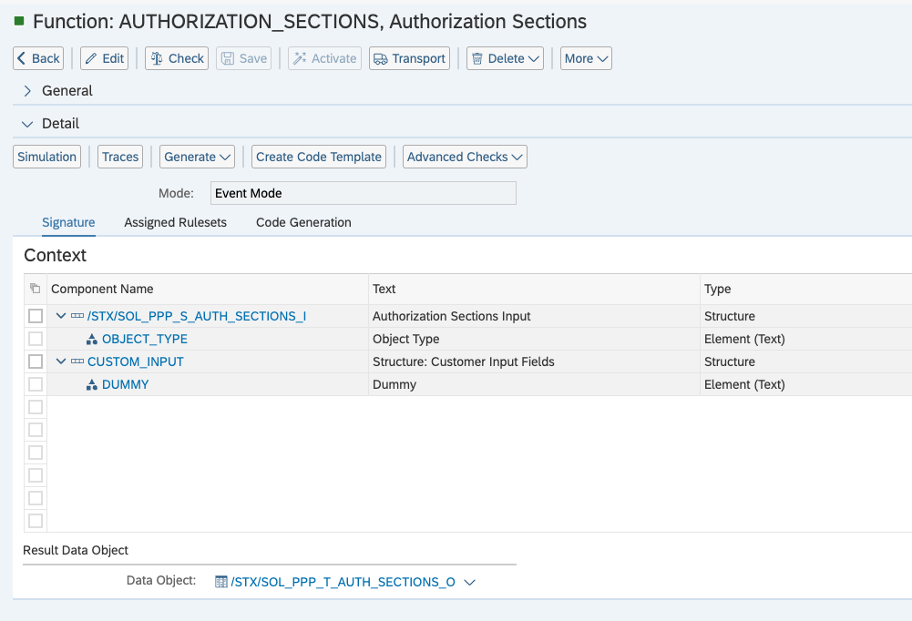 - /STX/SOL_PPP_… is a standard component that should not be changed in any function. This structure holds the technically required fields of the backend (e.g., Object Type). They also always have one Result Data Object.