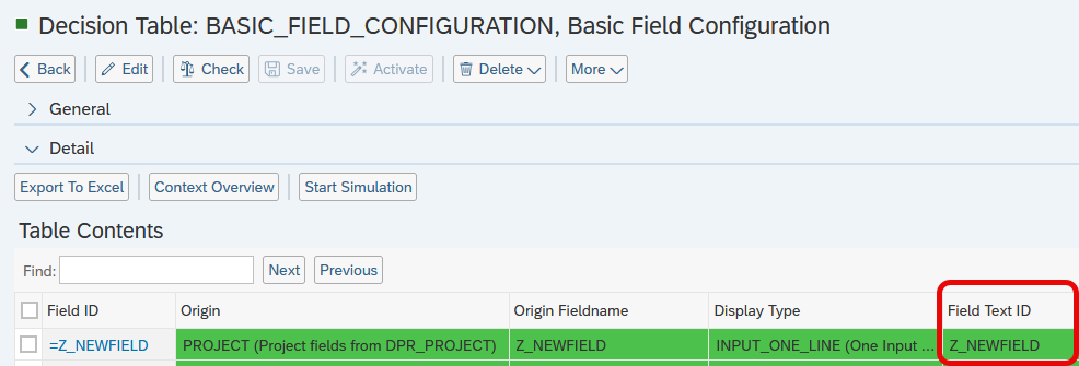 - Go to the decision table “BASIC_FIELD_CONFIGURATION” and check if you have already set the Field Text ID of a needed Field. For default Fields you can check Field Text ID in a Standard Application.