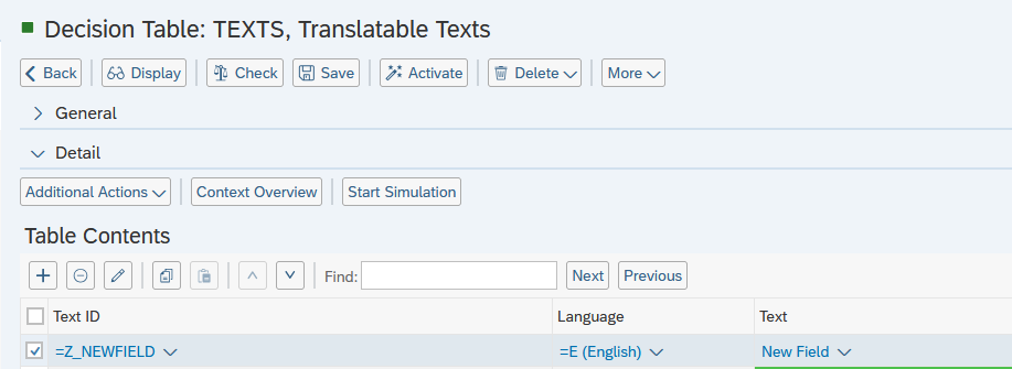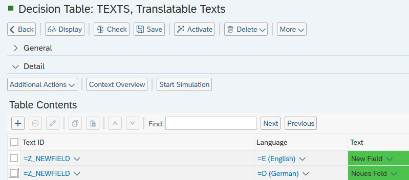 - Navigate to the Customer Application decision table “Translatable Texts” (Technical Name: TEXTS) and enter edit mode.