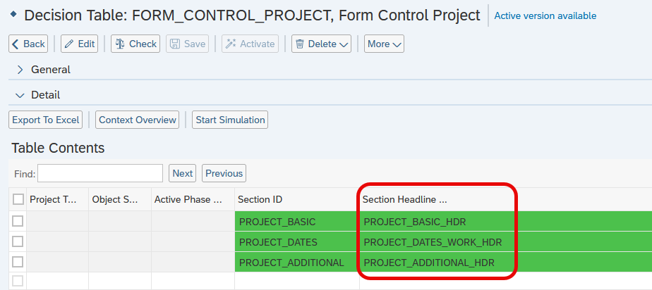 - Use the Section Headline Text ID (mentioned in the corresponding Form Control Decision Table) in the decision table: “TEXTS”, Translatable Texts.