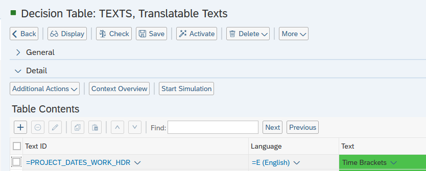 Before you can modify texts for Sections, Tabs, etc., the corresponding translatable texts must first be created. To do this, open your BRF+ Application and navigate to the decision table “Translatable Texts” (Technical Name: TEXTS).