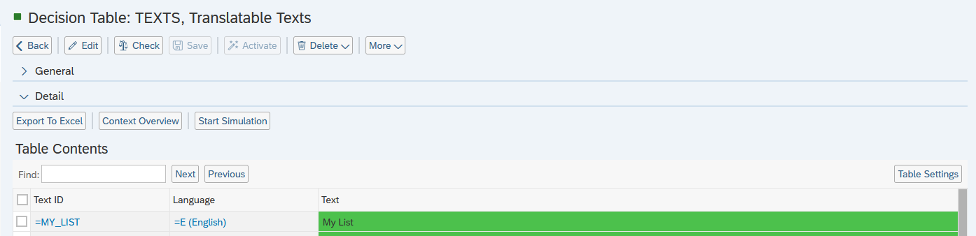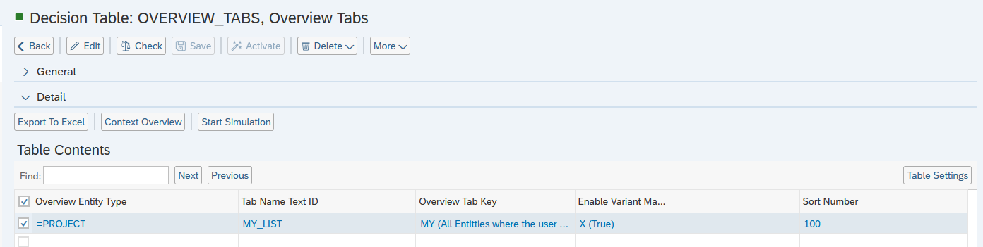 To start, make sure you’ve already created a BRF+ Applications (according to the guide Create a BRF+ App) and added a text for the new Overview Tab, following the guide Text. Once your BRF+ application is ready, open it and navigate to the decision table called “OVERVIEW_TABS.” This table is where you manage the Overview Tabs for both items and projects.