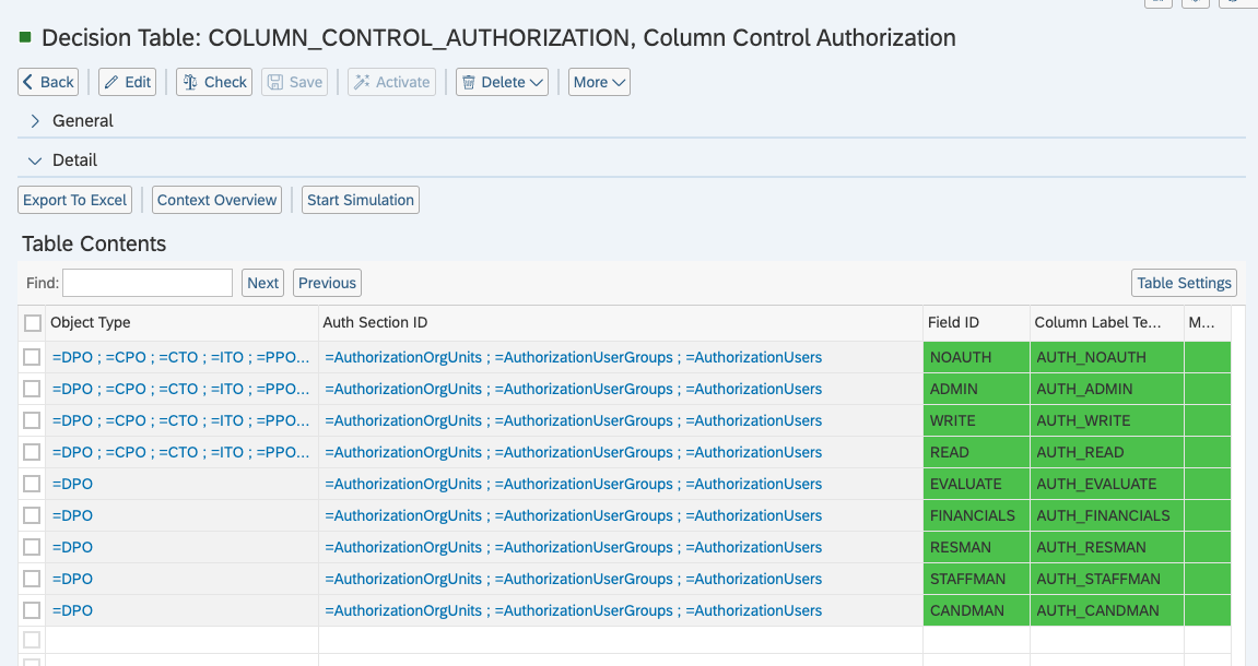 Open your BRF+ Application and navigate to the decision table “Column Control Authorization” (Technical Name: COLUMN_CONTROL_AUTHORIZATION).