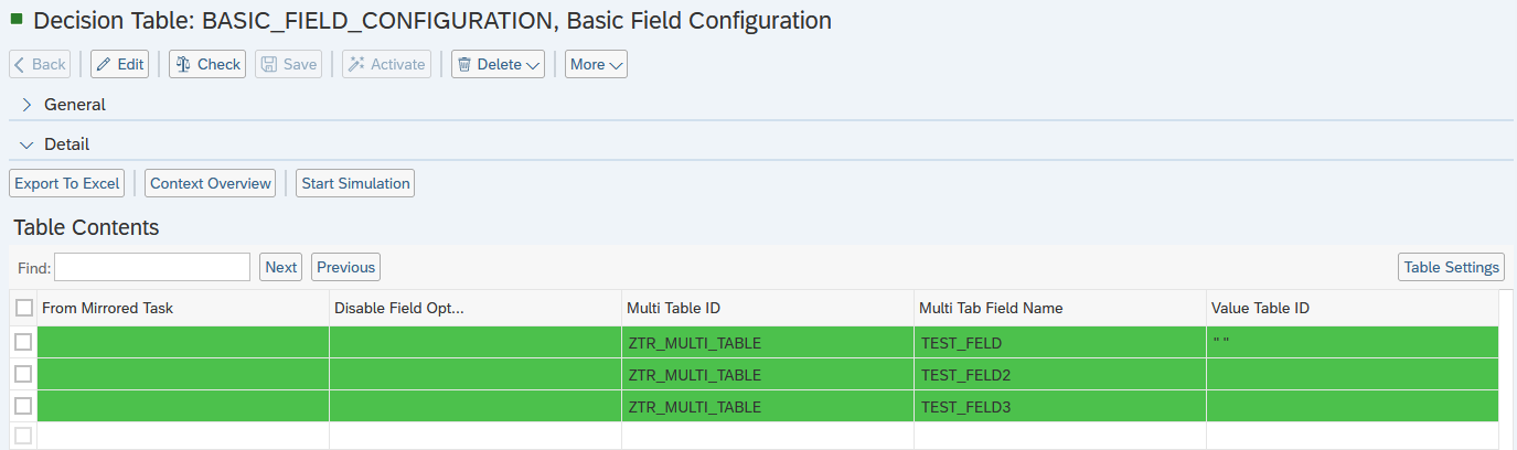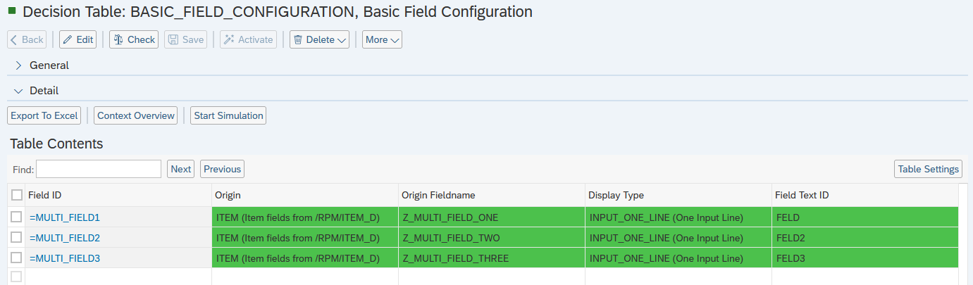 - The customized Multi Table should be added to one of the basic fields. For this, navigate to the Decision Table: BASIC_FIELD_CONFIGURATION, Basic Field Configuration.