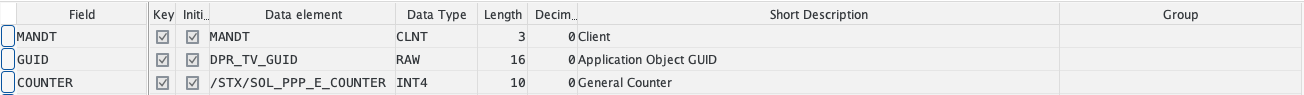 To ensure consistency in the use and custtomizing of PPP, you need to take a structured approach. When you set up your multi-table, you must therefore define two key fields. The first should be the GUID (Globally-Unique-Identifier). You can choose any name for this, but the field should be of type GUID (RAW 16). The second field represents the counter. This must have an integer as its type. An example of the key fields is shown here: