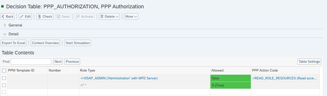 Open your BRF+ Application and navigate to the decision table “PPP Authorization” (Technical Name: PPP_AUTHORIZATION).