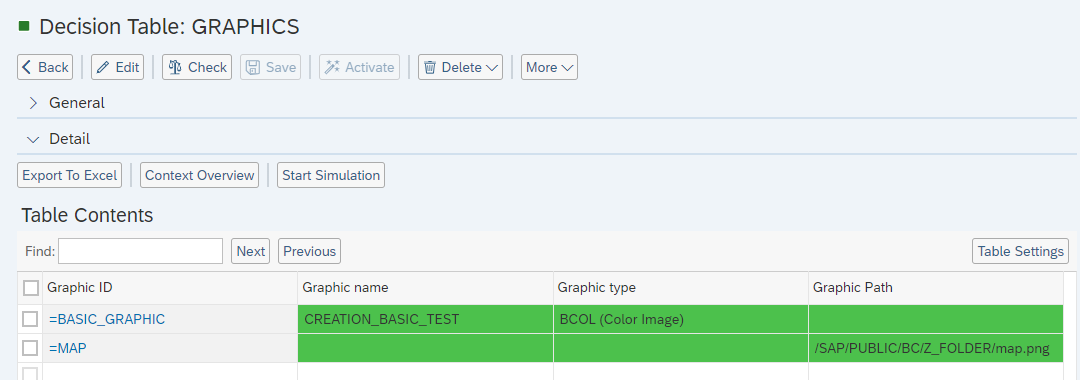 Open your BRF+ Application and navigate to the expression table “Graphic” (Technical Name: GRAPHICS).