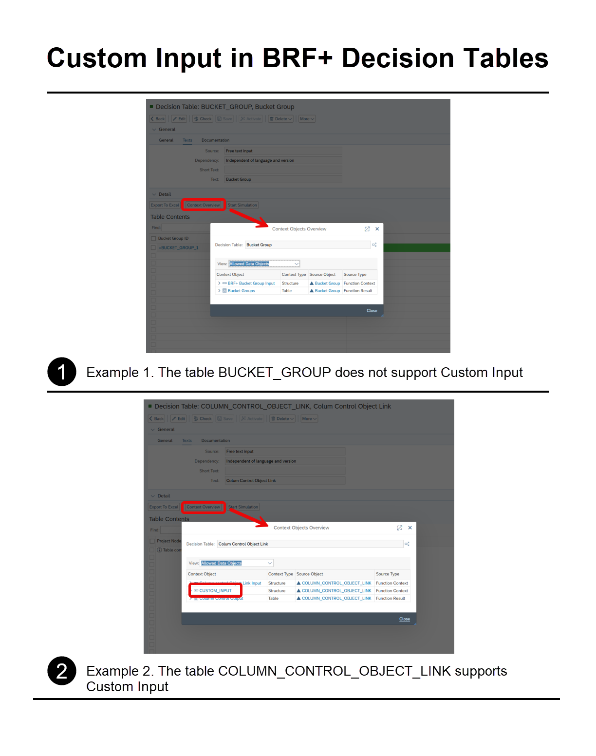 If you need to customize the structure of a decision table, the Custom Input feature allows you to tailor it to your specific requirements. With Custom Input, you can add a new or your own conditional column to the BRF+ decision table structure either by creating a new data object or by integrating an existing one. This enables more dynamic and customized decision-making logic. This capability is particularly useful for personalizing PPP to meet your unique needs, providing more nuanced and flexible application logic.