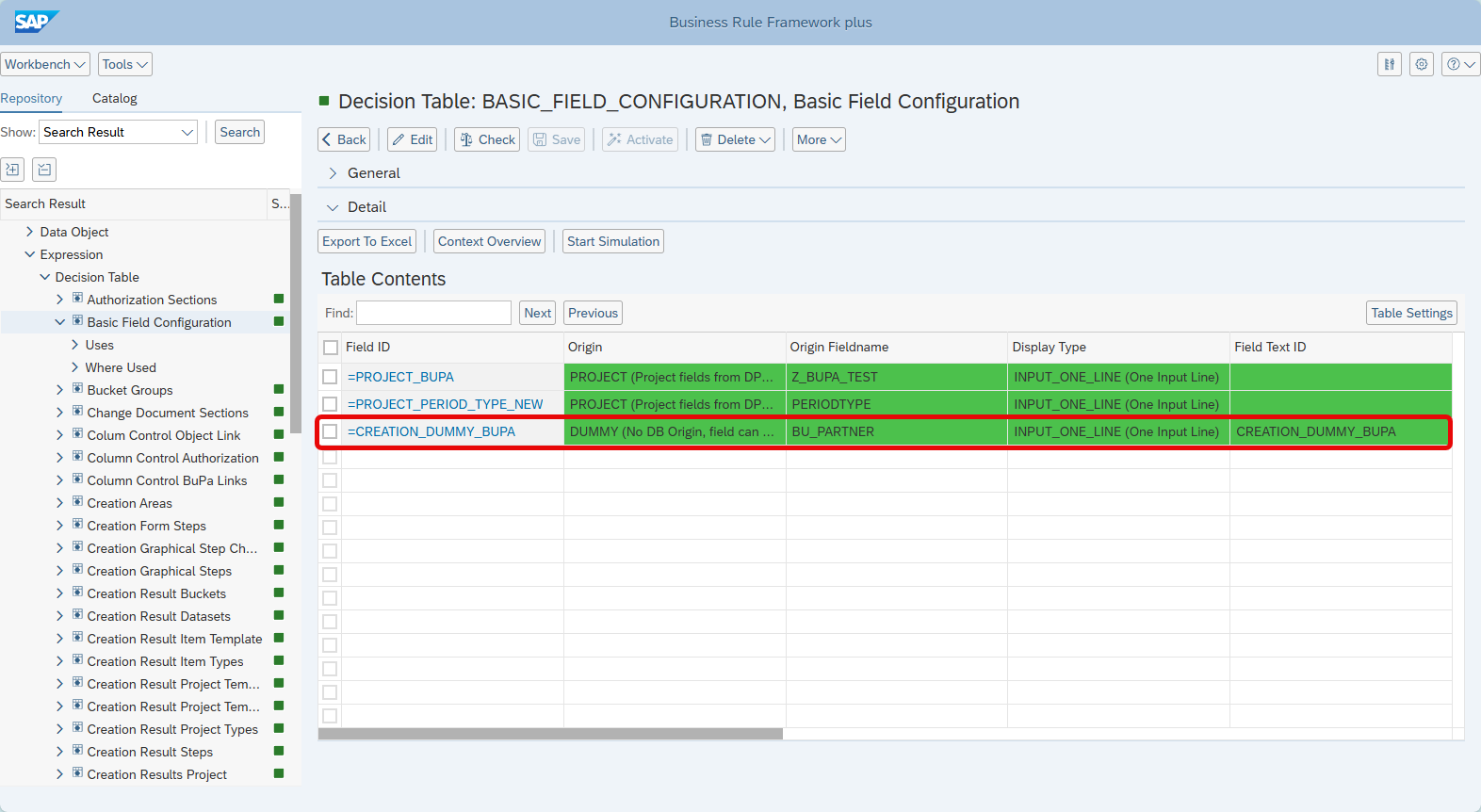 - Add your new field (CREATION_DUMMY_BUPA in the example above) as a condition column to the table, customizing creation steps (e.g., Creation Form Steps). For this, you should add your new field to