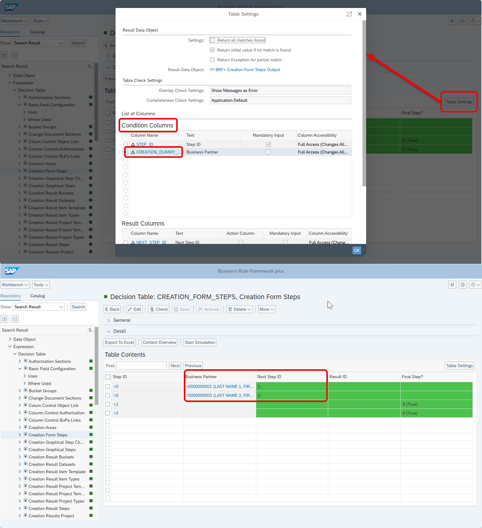Structure: Custom Inputaccording to Custom Input: Adding Custom Condition Columns to a BRF+ Decision Table. - Customize Result Columns according to your logic. As the example below shows, different Business Partner choices lead to different next steps.