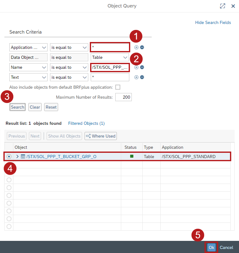 - Enter “*” into the Application Name search criteria. Paste the previously copied result data object name from the error message into the “Name” criteria. Hit “Search”. There should only be one result. Mark the entry and click on “Ok”