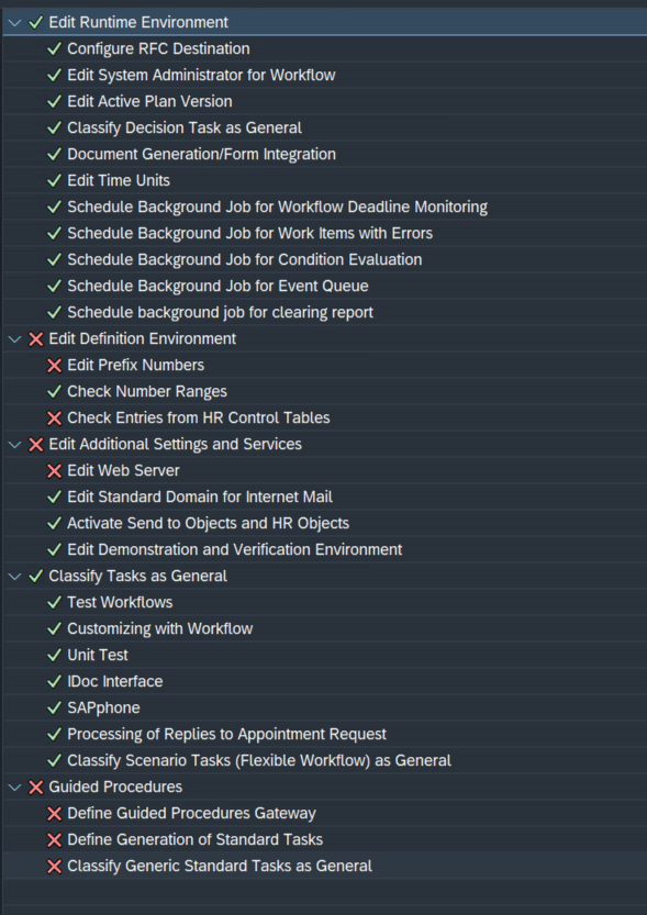- If the above settings are not green, perform corrective configuration or ensure missing transports/customizing are properly moved and activated