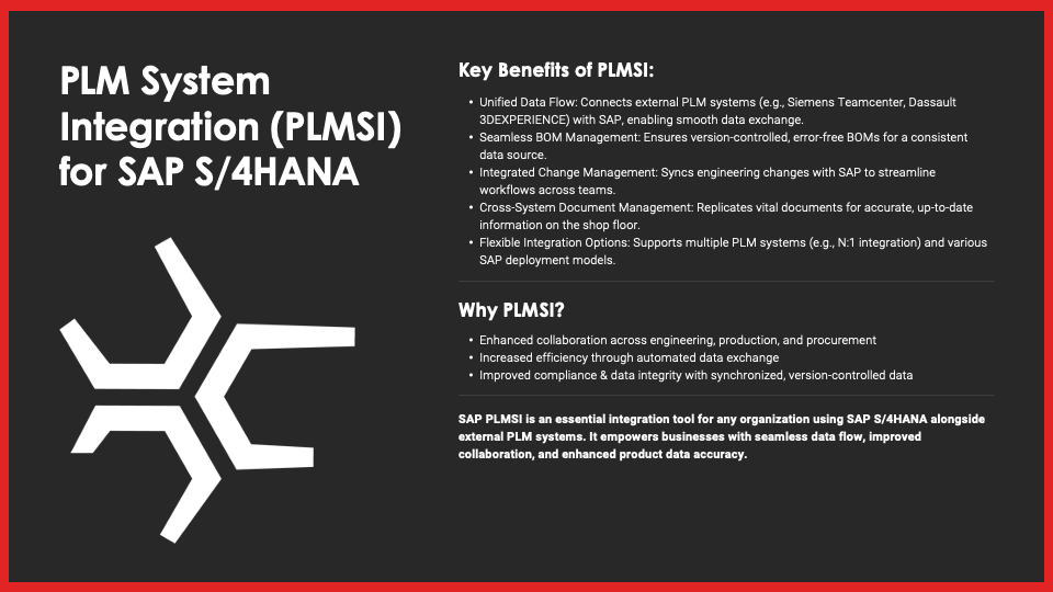 PLM System Integration (PLMSI) is an essential tool for any business using SAP S/4HANA or SAP ERP that also relies on external PLM systems. By providing a seamless connection between engineering and business processes, PLMSI improves collaboration, enhances data quality, and ensures that product lifecycle management is fully integrated into the ERP landscape. With a strong roadmap and continued enhancements, PLMSI will continue to support the evolving needs of modern product development and manufacturing.