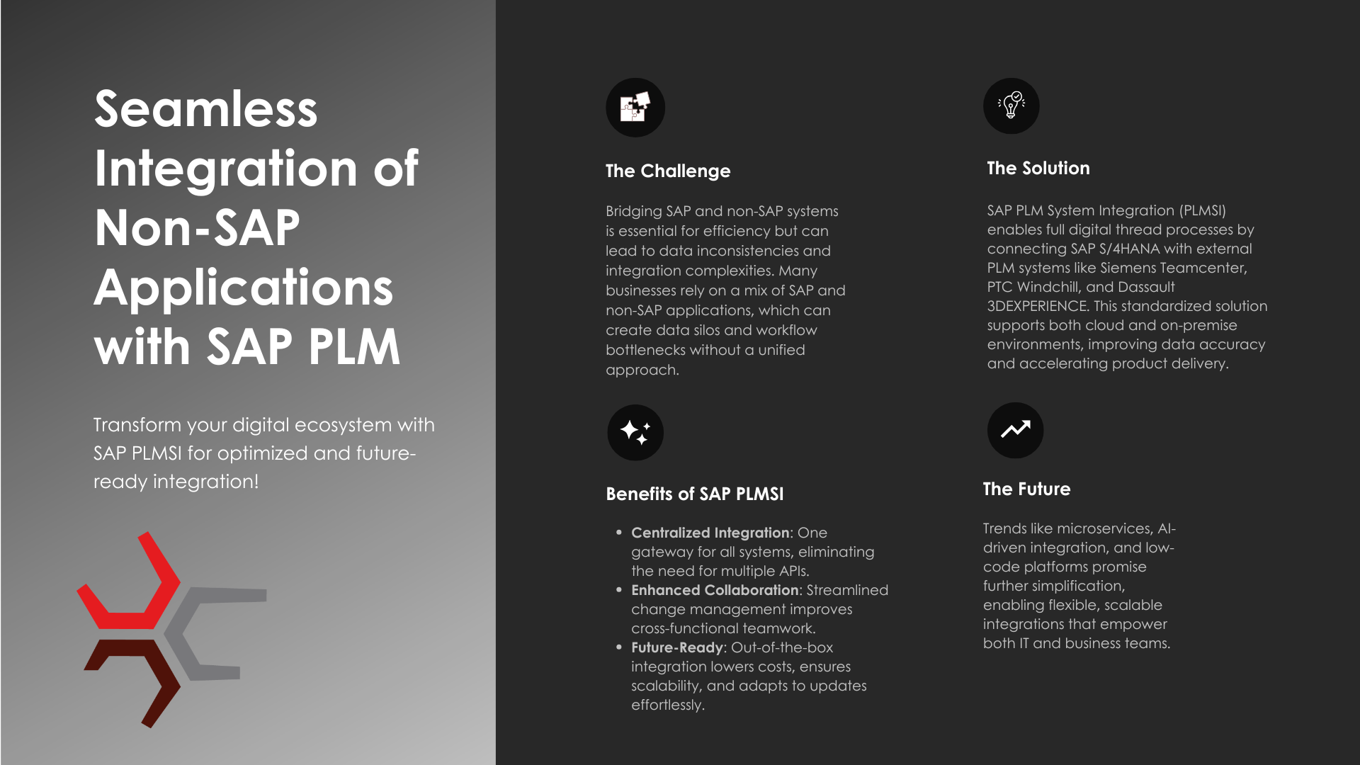 Bridging non-SAP applications with SAP PLM is essential for modern enterprises seeking to streamline operations, improve collaboration, and ensure data consistency across systems. By employing advanced business integration techniques such as PLM System Integration (PLMSI) can overcome integration challenges and build a seamless digital ecosystem. With future trends such as microservices, event-driven architectures, and AI-driven integration, the path forward promises even greater flexibility and efficiency in integrating diverse platforms with SAP PLM.